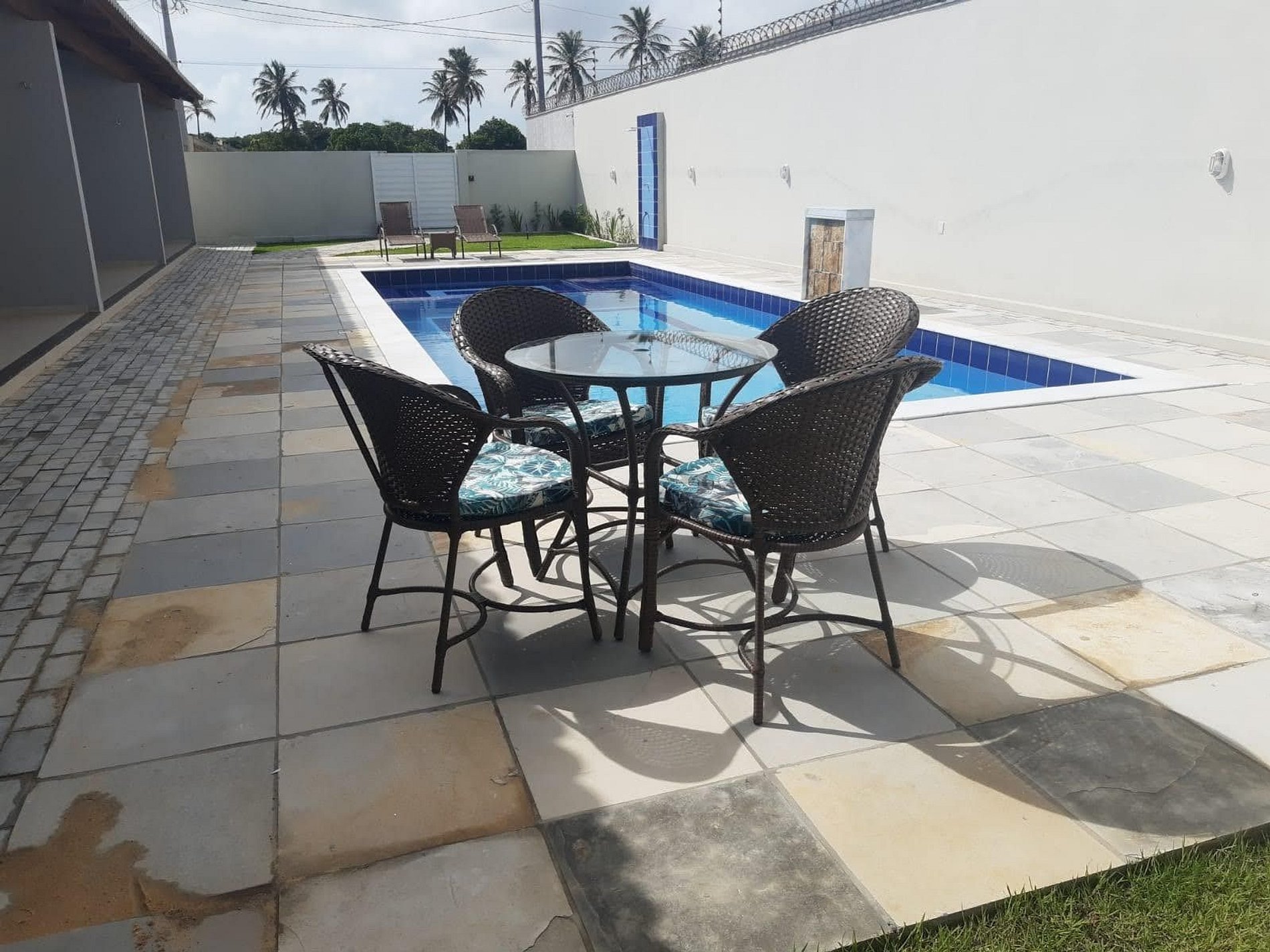 Não é permitido garrafas e outros vidros na área de piscina.
